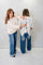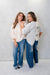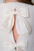 This knit pullover sweater features a solid crew neck, long sleeves, and an open back slit adorned with three delicate organza bows for a charming touch.