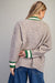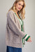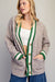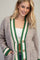 This soft, heathered knit cardigan showcases cream and green striped ribbed trim, a deep V-neck with large buttons, dropped shoulders, long sleeves with striped cuffs, and front patch pockets for a relaxed, preppy style.Model is 5'8" and wearing a small.